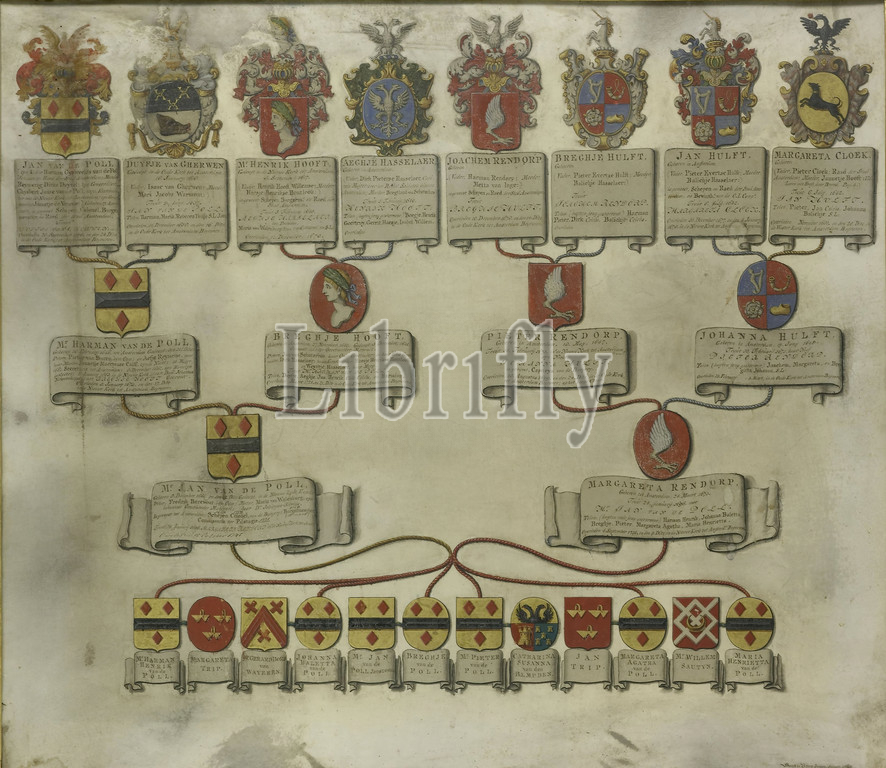 Weapon card, arms, six children, Jan van de Poll, Margaretha Rendorp, spouses, pedigree, eight quarters, Wapenkaart decorated, 1668-1745, 1673-1730, husbands, Trip, Bors van Waveren, van de Poll, van den Bempden, Sautijn, van Gherwen, Hooft, Hasselaer, Rendorp, Hulft, Cloek, Part, group, three weapons belonging, J.S.R donation, Arnhem, 1885, heraldic objects collection, Gerrit de Broen, II, 1738, parchment, animal material, ink, watercolor, paint