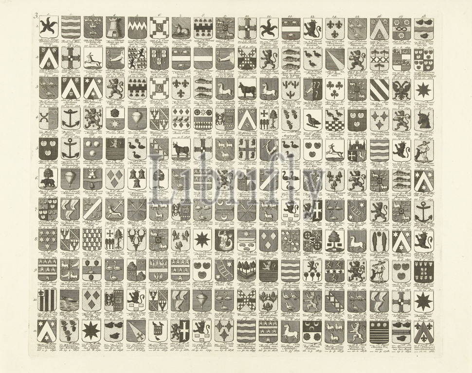 Weapon card with the weapons and names of the forty lords of the city of Leiden. gentlemen forty from the city of Leiden. Third print from series of four weapons cards with title page, register and assignment, offered to the mayors and rulers of the city of Leiden, Leiden, Abraham Delfos, 1758, paper, engraving, h 376 mm × w 446 mm
