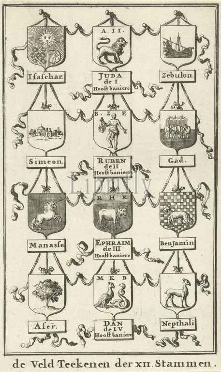 Weapons, twelve tribes, Israel, Field-Drawing, XII Tribes, title, object, biblical context, Jan Luyken, Amsterdam, 1683, paper, etching