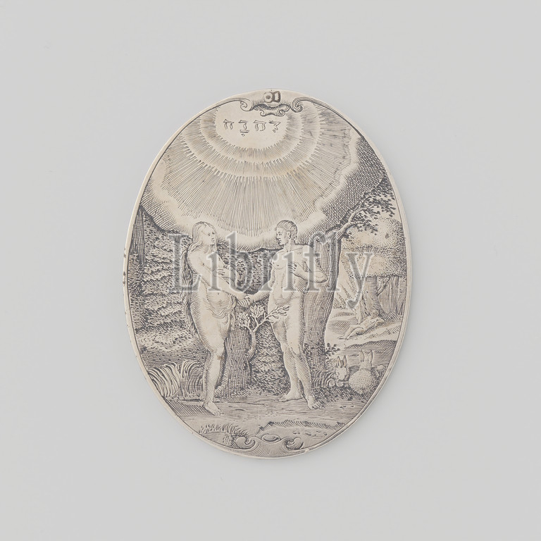 Wedding medal, black-and-white oval medal, Front, engraved representation, Adam, Eve, paradise, reach out, downside, cartouche decorated, lobster ornament, fruits, inscription, DEN MENSCH, EARTH SHOULD NOT BE EARTHED, SPEAK GODES VOICE, THEREFORE HE CREATED, SIDE, SIJ, GAFF SE HEM, God brings Eve, fashioned, Adam's rib, Netherlands, c, 1600, 1625, black-and-white, metal, engraving, l 6