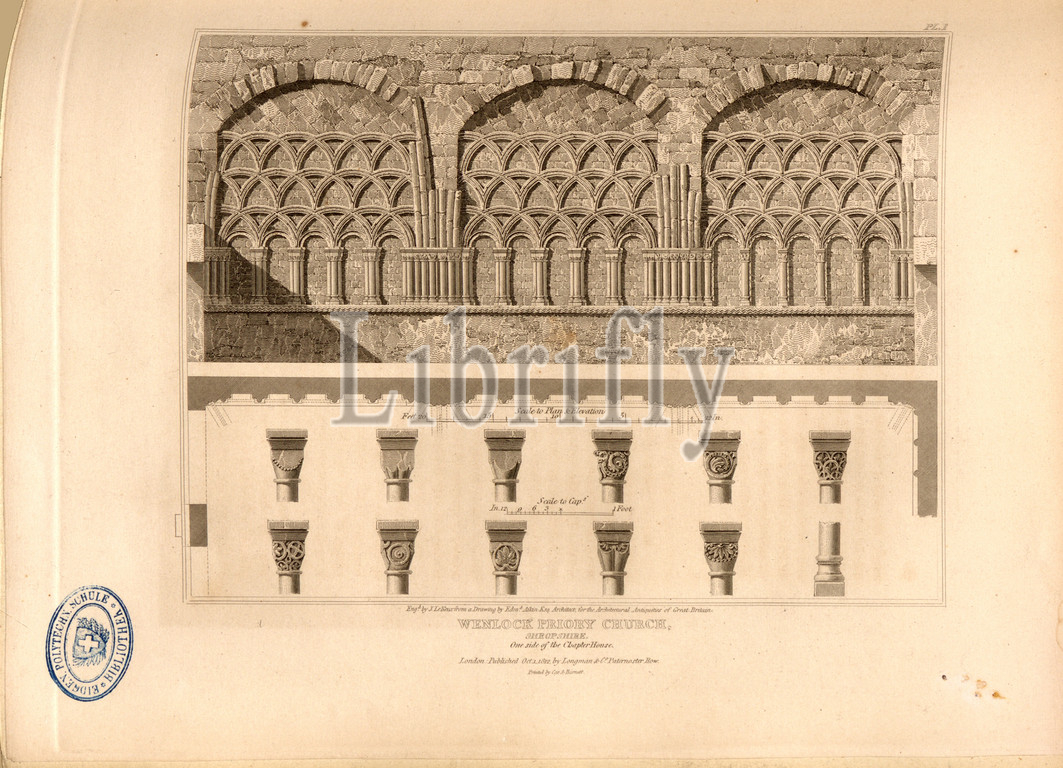 Wenlock Priory Church, Shropshire, Details of Wenlock Abbey in Shropshire, signed: Eng., by J. Le Keux from a Drawing by Edm., Aikin, Published by Longman & Co, Fig. 16, Pl. I, after p. 60, Aikin, Edmund (drawing); Keux, John Le (engraving); Longman & Co. (published), 1812, John Britton: The architectural antiquities of Great Britain: represented and illustrated in a series of views, elevations, plans, sections and details of various ancient English edifices: with historical and descriptive accounts of each. Bd. 4. London: J. Taylor, 1807-1826