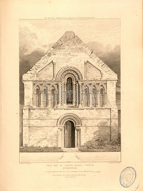 West end of Castle Rising Church, Norfolk, St Lawrence Church at Castle Rising in Norfolk, signed: Drawn by G. Cattermole; Engraved S. Rawle; Published by Longman & Co, Fig. 14, after p. 260, Cattermole, George (drawing); Rawle, Samuel (engraving); Longman & Co. (published), 1819, John Britton: The architectural antiquities of Great Britain: represented and illustrated in a series of views, elevations, plans, sections and details of various ancient English edifices: with historical and descriptive accounts of each. Bd. 5. London: J. Taylor, 1807-1826