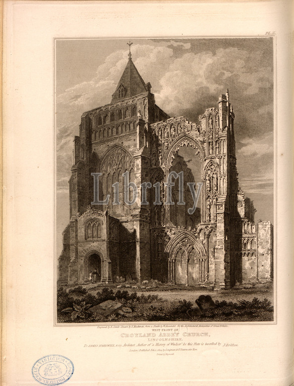 West front of Croyland Abbey Church, Lincolnshire, Church of the Crowland Abbey in Lincolnshire, signed: Engraved by R. Sands - Drawn by F. Mackenzie, form a Sketch by W. Alexander; Published by Longman & Co, Fig. 28, Pl. II, after p. 96, Alexander, W. (sketch); Mackenzie, F. (drawing); Sands, Robert (engraving); Longman & Co. (published), 1814, John Britton: The architectural antiquities of Great Britain: represented and illustrated in a series of views, elevations, plans, sections and details of various ancient English edifices: with historical and descriptive accounts of each. Bd. 4. London: J. Taylor, 1807-1826