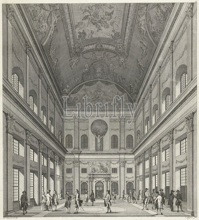 West side of the Citizens' Hall in the City Hall on Dam Square, Cornelis Bogerts, after Hendrik Keun, 1771 - 1783, The west side of the Citizens' Hall in the City Hall on Dam Square in Amsterdam. In the background, in the middle, is the door to the Aldermen's Room. Above in the center Justitia (Justice), under her feet King Midas as personification of Greed and Medusa as personification of Envy. To the left of Justice Death, to the right the personification of Punishment. Above it, the statue of Atlas. In the room several figures are walking and talking. Below the scene the title in Dutch and French. Numbered in the upper right: 4., print maker: Cornelis Bogerts, (mentioned on object), intermediary draughtsman: Hendrik Keun, (mentioned on object), publisher: Pierre Fouquet, (mentioned on object), Amsterdam, 1771 - 1783, paper, etching, engraving, h 365 mm × w 305 mm