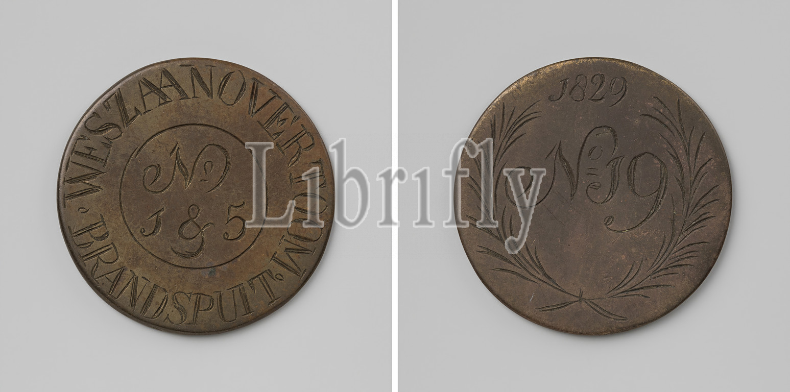 West Zaan Overtoom, fire spray token with no. 19, Brass token. Front: inscription No. 1 & 5 inside circle and circumscription. Reverse: inscription No. 19 within wreath of willow branches under year, Overtoom, Westzaan, anonymous, 1829, brass (alloy), engraving, d 3.4 cm × w 111 gr