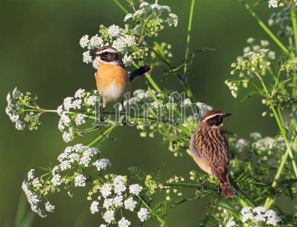 Whinchat pair in Cow Parsley, Saxicola rubetra, Netherlands