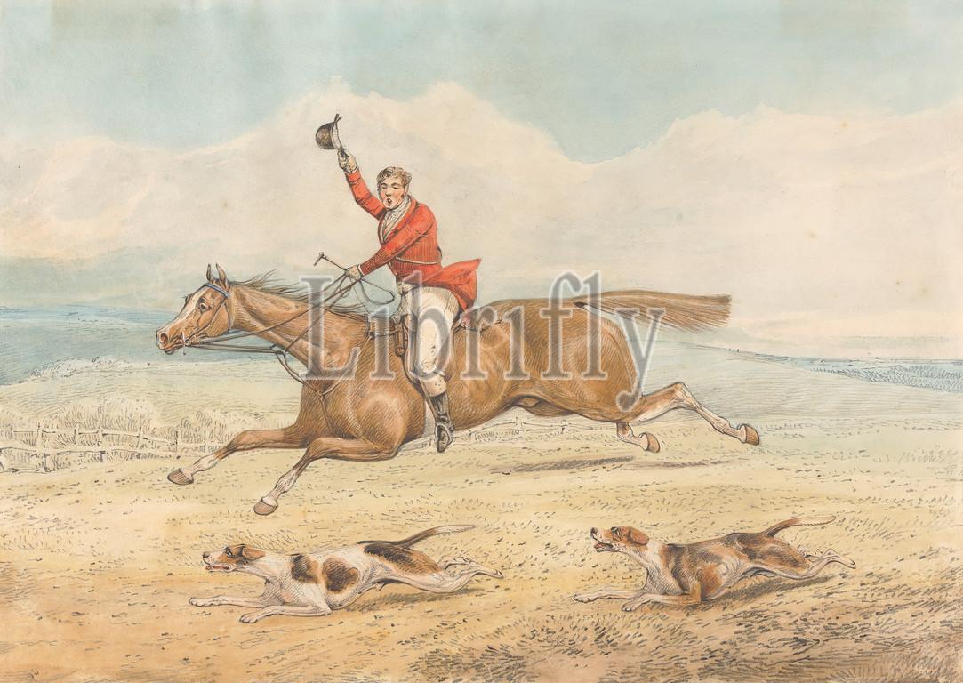 Whipper-, Couple, Hounds Running Hard, Open Country, Henry Thomas Alken, 1785–1851, British, Graphite, watercolor, medium, slightly textured, cream, wove paper, Sheet, dogs, animals, fence, field, galloping, hat, horse, animal, horseback riders, horseback riding, hounds, dogs, landscape, man, running, sporting art