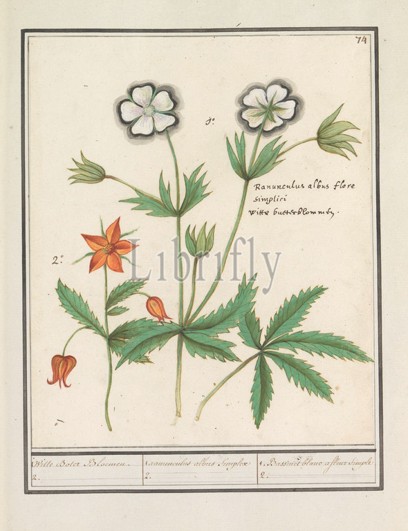 White buttercup (Ranunculus) and an unknown flower, 1. White Buttercups. 2. / 1. ranunculus albus Simplex 2. / 1. Bassinet blanc a fleur Simple 2. (title on object), White buttercup (ranunculus) and an unknown orange flower. Numbered top right: 74. With the Latin and Dutch name. Part of the first album with drawings of flowers and plants. Eighth of twelve albums with drawings of animals, birds and plants known around 1600, commissioned by Emperor Rudolf II. With explanations in Dutch, Latin and French, Anselmus Boetius de Boodt, 1596 - 1610, paper, watercolor (paint), deck paint, chalk, ink, pen, h 231 mm × w 194 mm