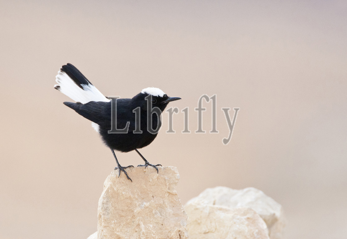 White-crowned Wheatear perched on lookout, Oenanthe leucopyga, Israel