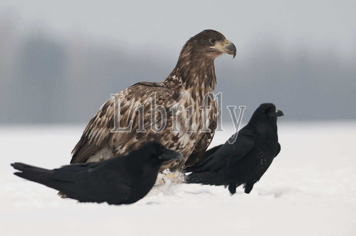 White-tailed eagle and Raven in snow, Poland