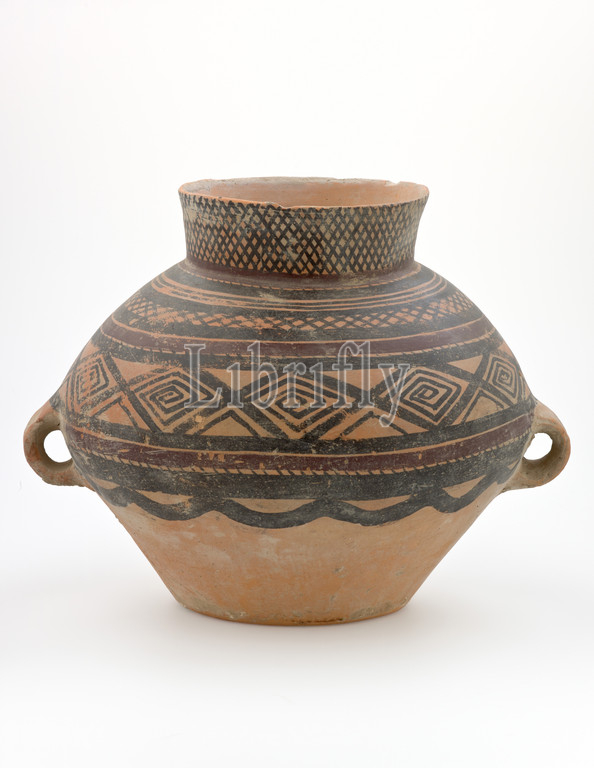 wide mouth storage jar, bands, lozenge-spiral design, Neolithic, 2200-2000 B.C.E., earthenware, paint, Machang type, 10-1/2 x 13 x 11-1/4, Asian Art