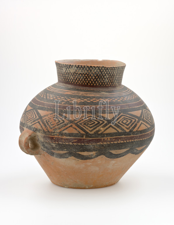 wide mouth storage jar, bands, lozenge-spiral design, Neolithic, 2200-2000 B.C.E., earthenware, paint, Machang type, 10-1/2 x 13 x 11-1/4, Asian Art