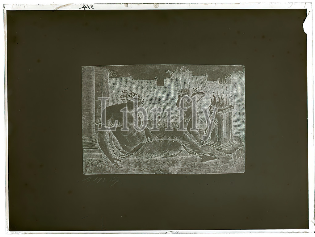 Wilhelm Weimar, glass negative, black, white negative process, numbered, top left, in black ink, woman, history, Cupid, Cupid, Eros, snakes, crying, tears, death, bow, arrow, hunting, lying female nude, fire, art, drawing