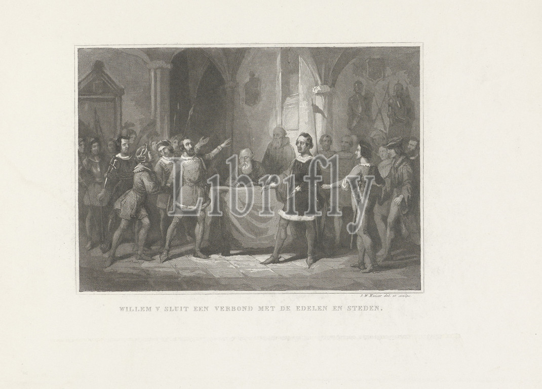 Willem V makes a covenant with the nobles and cities Willem V makes a covenant with the nobles and cities (title on object), Count Willem V makes a covenant with the nobles and cities, 23 May 1350 In the hall of a castle, William V is surrounded by nobles. Behind a table is a clerk who draws up a document, Netherlands, Willem V van Holland (count of Holland and Zeeland), Johann Wilhelm Kaiser (I) (mentioned on object), 1840 - 1884, paper, steel engraving, h 208 mm × w 287 mm