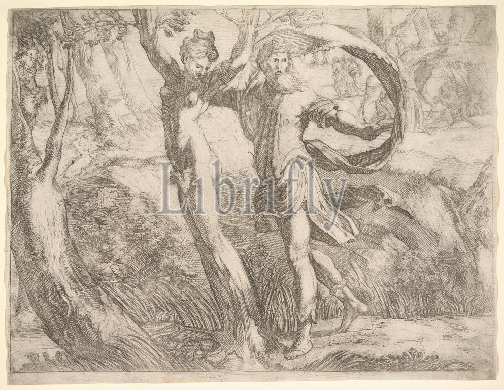 Wilton Album, folio 10a: Priapus and Lotis, ca. 1530–50, Etching, Sheet: 7 7/8 x 10 3/4 in. (20 x 27.3 cm), Prints, Anonymous, Italian, 16th century, Based on a drawing attributed to Parmigianino (Girolamo Francesco Maria Mazzola) (Italian, Parma 1503–1540 Casalmaggiore), Based on a drawing attributed to Girolamo Mazzola Bedoli (Italian, Viadana ca. 1505–ca. 1570 Parma), Etching tentatively attributed to Bertoia (Jacopo Zanguidi) (Italian, Parma 1544–?1573 Caprarola (?)) by Diane De Grazia (1991), Priapus, the ithyphallic god of gardens and fertility and the incarnation of unbridled carnal lust, was a favorite character in the erotic poetry of antiquity and the Renaissance. Long believed to represent Apollo and Daphne, this print instead illustrates a scene from the story of Priapus and Lotis narrated in Ovid's Fasti (elegiac verses commemorating the rustic rituals and celebrations of the ancient Roman calendar) in which the fleeing nymph is transformed into a tree to avoid the rapacious god's advances