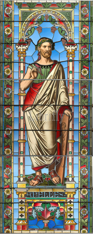 Window, representation Apelles, Window stained, Apelles, personification, painting, left hand, holds, canvas, right, drawing pen, stands, two columns, Gothic capitals under, arch, bunches, grapes, pedestal, inscription Apelles, Tiroler Glasmalerei und Cathedralenglashuette, Innsbruck, 1882, 1883, glass