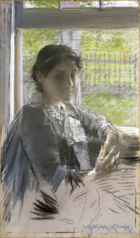 Window, William Merritt Chase, American, 1849-1916, Pastel, hand-applied gray ground, commercially pre-printed canvas attached, wooden stretcher, ca. 1889, 18 3/8 x 10 7/8, 46.7 x 27.6 cm, ca. 1889, drawing, female figure, gaze, pastel, portrait, sitter, study, window, woman