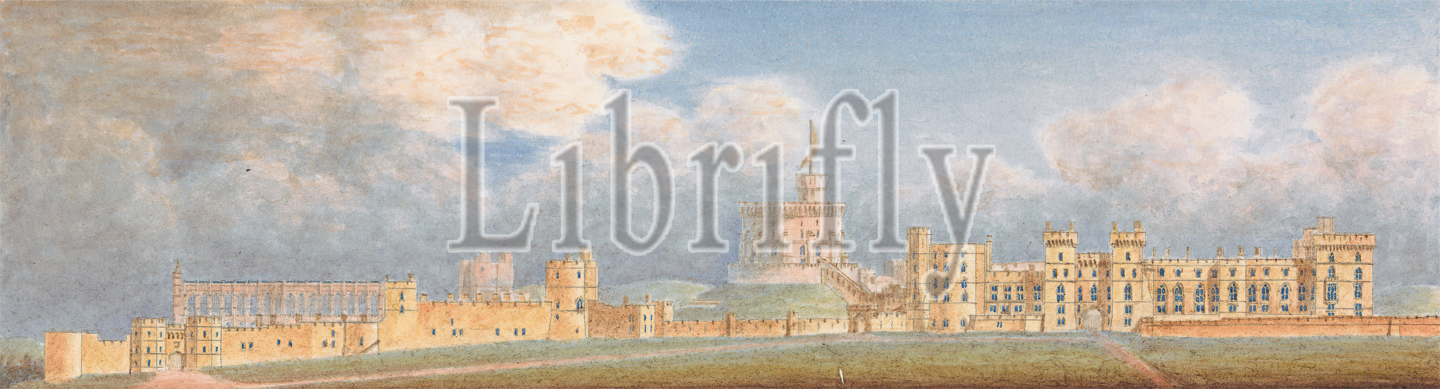 Windsor Castle, Berkshire: Distant View from the South, Studio of Sir Jeffry Wyatville, 1766–1840, British, ca. 1830, Graphite, pen and black ink and watercolor on slightly textured, moderately thick, white wove paper, Sheet: 3 × 8 1/4 inches (7.6 × 21 cm), architectural subject, castle, clouds, hill, Berkshire, England, United Kingdom, Windsor, Windsor Castle