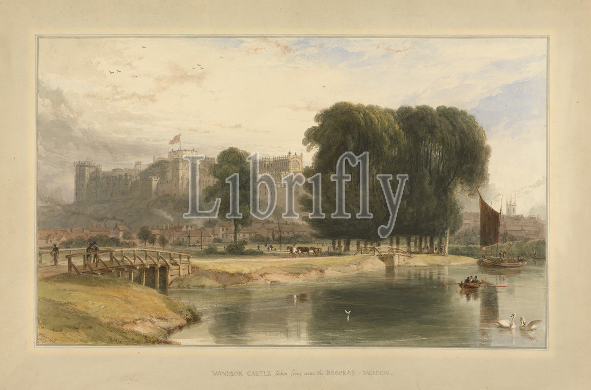 Windsor Castle, Brocas Meadows, William Daniell, 1769–1837, British, 1827, Watercolor, pen, brown ink, gray ink, graphite, gouache, scratching out, medium, slighly textured, cream wove paper, mounted, thick, slightly textured, beige, wove card paper, Mount, Contemporary drawn border, Sheet, architectural subject, castles, landscape, trees, Windsor Castle