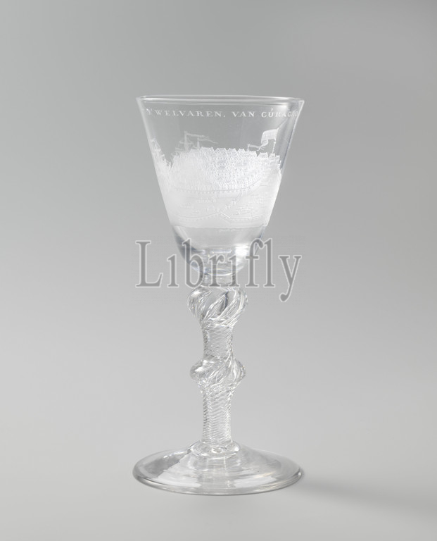 Wine glass, view, port, Willemstad, principal slave market, Curacao Wine glass, Willemstad Chalice, Vaulted foot, Double railing stem, air bubbles, spiral turns, Conical cup, rounded bottom, chalice, wheel engraving, island, completely crammed, houses, o, Walls, cannons, r b, large flag, l, ship halfway, furthermore two ships, sea, Inscription, rim, chalice b, 't 'WELVAREN, CURACAO, Signed, m, under engraving, Jacob, Sang, fc, Dated, 1756, sailing-ship, sailing-boat, Curaçao, Simon Jacob Sang, Netherlands, glass, glassblowing