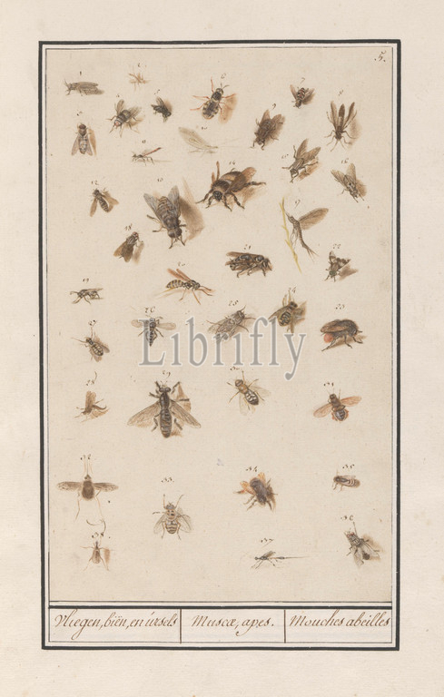 38 Winged Insects, Leaf, thirty-eight winged insects, Flies, beers, ursels, Muscae, apes, Mouches abeilles, title, object, bees, bumble bees, flies, wasps, numbered 1-38, Numbered top right, 5, Part, sixth album, drawings, fish, shells, insects, Sixth, twelve albums, animals, birds, plants, 1600, commissioned, Emperor Rudolf II, explanations, Dutch, Latin, French, bee, NAME, wasp, fly, Anselmus Boetius de Boodt, Praag, 1596, 1610, paper, pencil, chalk, watercolor, paint, deck paint, ink, pen