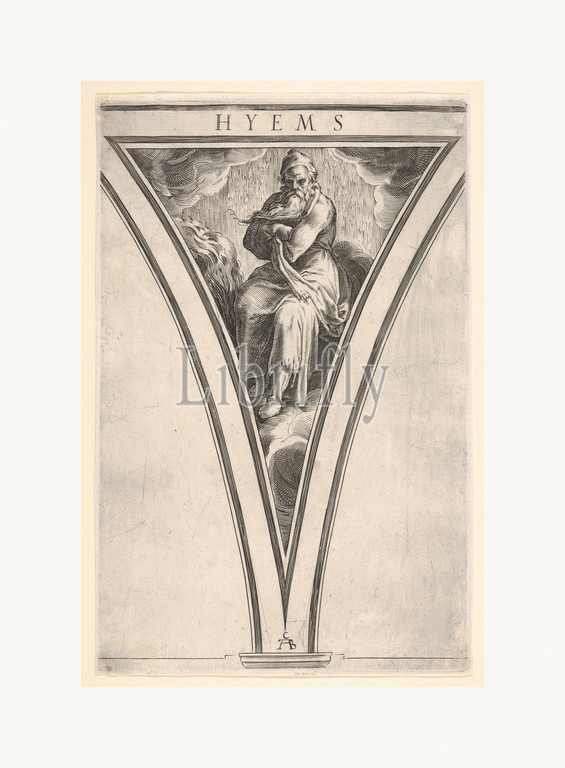 Winter, Hyems, represented, seated man crossing, arms across, chest, spandrel-shaped composition, series, Four Seasons, Polidoro da Caravaggio, ca, 1570–1615, Engraving, sheet, 9 13/16 x 6 5/16, 25 16 cm, Prints, Cherubino Alberti, Zaccaria Mattia, Italian, Borgo Sansepolcro, 1553–1615, Rome, After Polidoro, Caravaggio ca., 1499–ca., 1543, Messina
