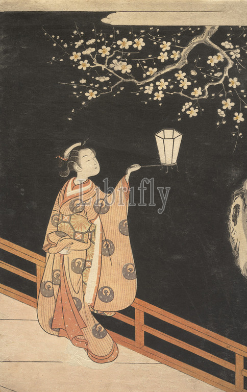 Woman Admiring Plum Blossoms at Night, Edo period (1615–1868), Japan, Polychrome woodblock print with embossing (karazuri); ink and color on paper, Image: 12 3/4 x 8 1/4 in. (32.4 x 21 cm), Prints, Suzuki Harunobu (Japanese, 1725–1770), In this print, one of Harunobu's most poetic images, a nymphlike beauty dressed in an elegant kimono stands holding a lantern and gazing dreamily at the plum blossoms. The image of admiring plum blossoms at night is a classical theme in the East Asian poetic tradition, and Harunobu's lyrical rendition has much in common with the art of the Heian period (794–1185)