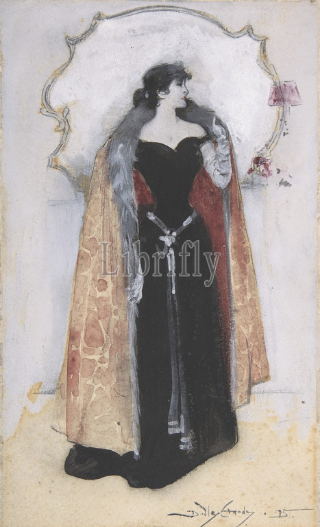Woman, evening clothes, cape standing, front, mirror, 1895, Watercolor, graphite, touches, pastel, sheet, 11 1/4 x 6 3/4, 28.6 17.1 cm, Dudley Hardy, British, Sheffield, Yorkshire, 1867–1922, London