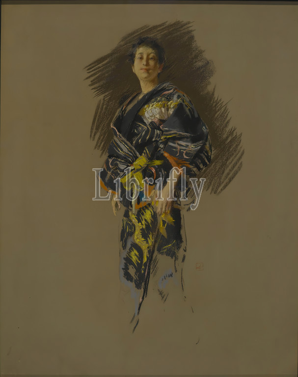 Woman in a Japanese Costume, Robert Frederick Blum, American, 1857-1903, Pastel on thick paper with a mauve/gray textured ground, mounted to paperboard and attached to a wooden strainer, ca. 1890-1892, 28 5/16 x 22 3/8 in., 71.9 x 56.8 cm, costume, drawing, fine lines, kimono, oriental, Orientalism, pastel, portrait, sketch, unfinished, woman