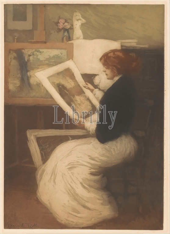 Woman looking, print, Interior showing, seated woman, print, hands, Next, portfolio, prints, leaning, easel, painting, background, cabinet, statue, vase, roses, print maker, Manuel Robbe, mentioned, object, Paris, 1882, 1936, paper, height 532 mm × width 377 mm