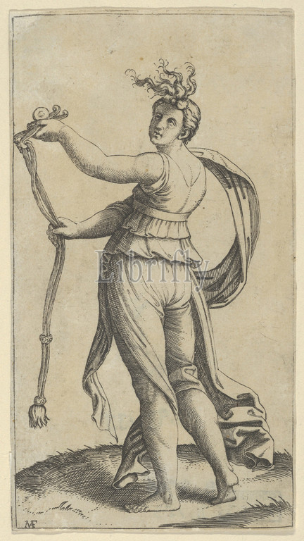 A woman representing Temperance holding a bit facing left, ca. 1510–27, Engraving, Sheet: 5 1/4 × 2 15/16 in. (13.4 × 7.4 cm), Prints, Marcantonio Raimondi (Italian, Argini (?) ca. 1480–before 1534 Bologna (?))