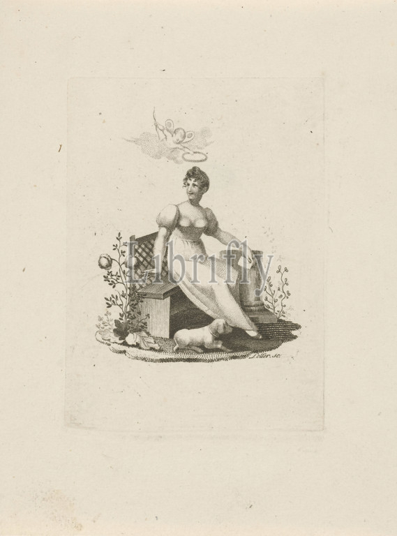 Woman sitting, bench, young woman, sitting, outdoor bench, letter, hands, putto, laurel wreath flies, air, feet lies, dog, sitting figure, AA, female human figure, cupids, amores, amoretti, putti, Christian Anthony Lotter, mentioned, object, 1797, 1838, paper, engraving