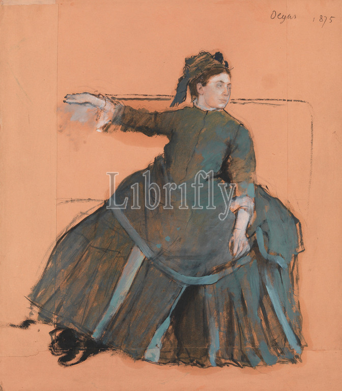 Woman on a Sofa, 1875, Oil colors freely mixed with turpentine, with touches of pastel, over graphite underdrawing, on pink paper, 19 1/8 x 16 3/4 in. (48.6 x 42.5 cm), Drawings, Edgar Degas (French, Paris 1834–1917 Paris), This seems to be an independent work that was developed in two stages. It probably began as a pencil drawing on a smaller sheet of paper that was enlarged by adding strips of paper at the bottom and sides