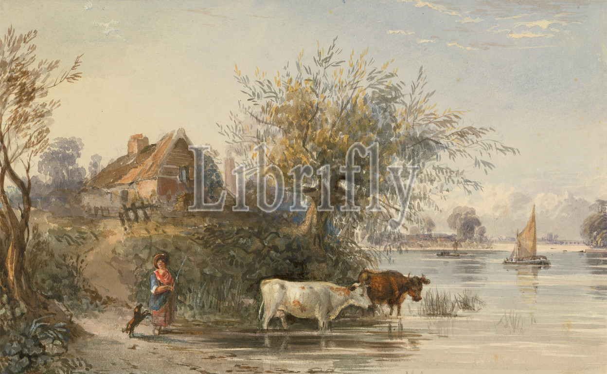 Woman Tending Cattle, River, R, P, Noble, active 1829–1861, ca, 1840, Watercolor, graphite, gouache, medium, smooth, cream wove paper, Sheet, cattle, dog, animal, genre subject, house, landscape, river, river banks, riverboat, trees, woman