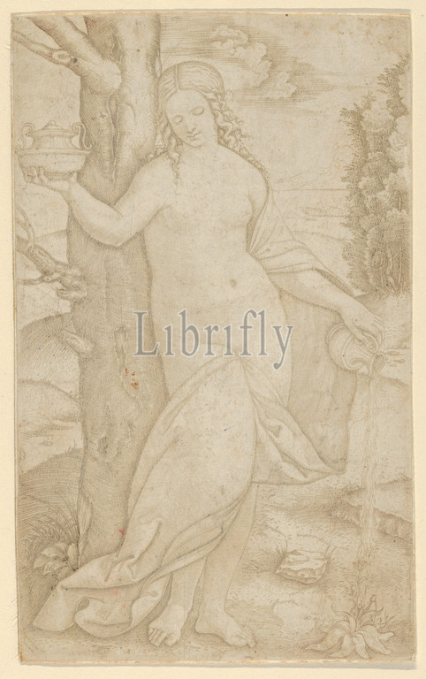 woman watering, plant, pot, raised right hand, ca, 1507–8, Engraving printed, pale brown ink, Sheet, 7 1/2, 4 5/8, 19.1, 11.7 cm, Prints, Marcantonio Raimondi, Italian, Argini, ca., 1480–before, 1534, Bologna