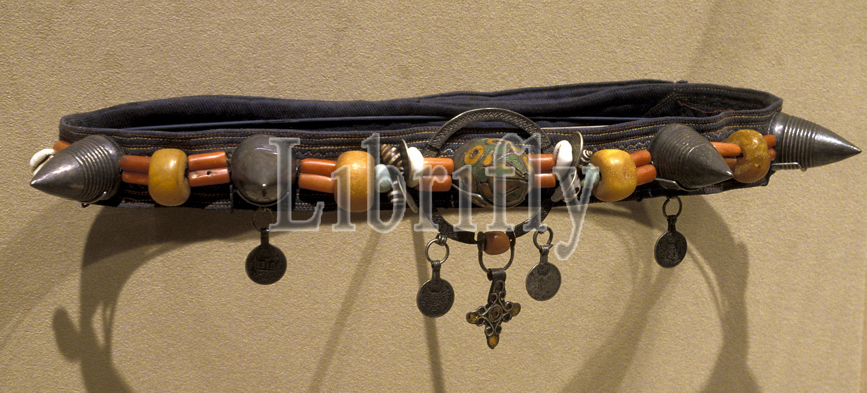 woman's headpiece, Berber peoples, 1901-1925, leather, silver, coral, amber, stone, shell, 3-1/2 x 35-1/4 x 2 in., African Art