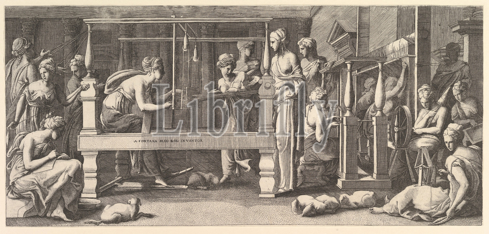 Women spinning, weaving, sewing, 1540–50, Engraving, sheet, 7 7/8 x 17, 20 43.2 cm, Prints, Master FG, Italian, active mid-16th century, After Francesco Primaticcio, Bologna, 1504/5–1570, Paris