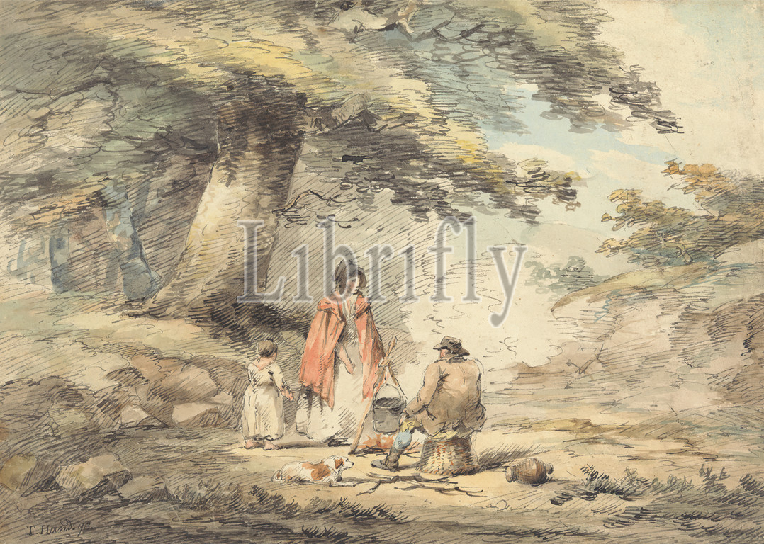 Wooded Landscape, Figures Round, Cooking Pot, Thomas Hand, died 1804, British, 1793, Watercolor, pen, black ink, graphite, medium, slightly textured, cream wove paper, Sheet, child, cooking, figures, fire, genre subject, landscape, man, pot, woman, woods