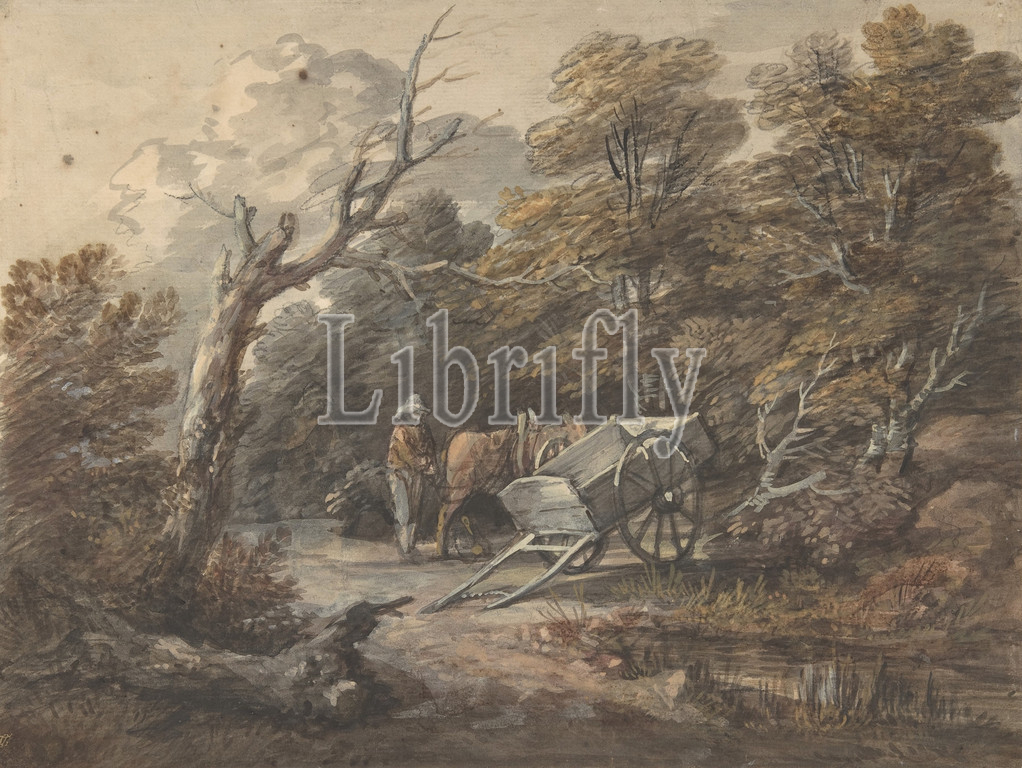 Woodland Scene, Peasant, Horse, Cart, ca, 1760, Watercolor, gouache, gray wash, black chalk, off-white laid paper, Sheet, 9 1/2 x 12 11/16, 24.1 32.2 cm, Drawings, Thomas Gainsborough, British, Sudbury, 1727–1788, London, boldly, drawn, colored, drawing, belongs, series executed, 1760s, Gainsborough lived, spa town, Bath, 1759–74, period, contrasts, light, shadow, forms fresh, legible, artist, highly finished