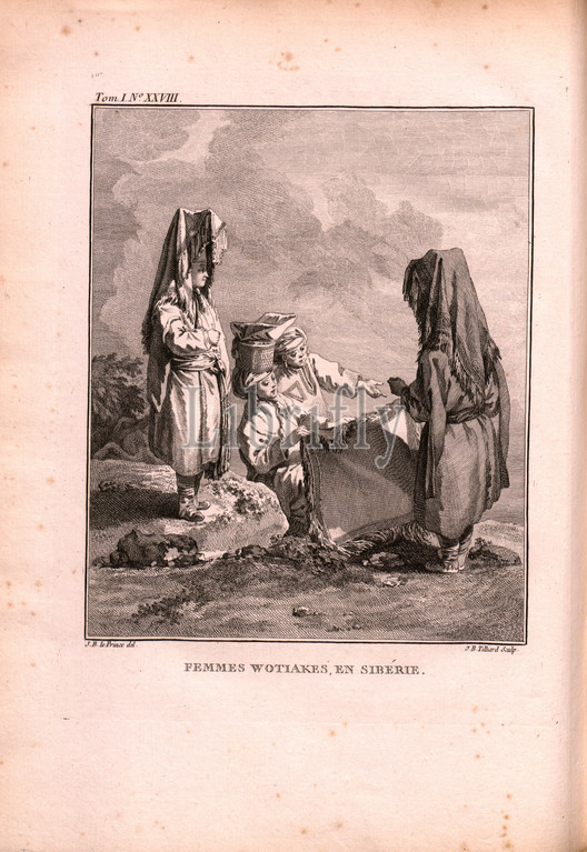 Wotiakes women in Siberia, Clothing and headgear of the Wotjak (Udmurt) women in Siberia, Signed: J. B. Le Prince (del.), J. B. Tilliard (sculp.), Copper engraving, no. XXVIII, after p. 338 (vol. 1), Le Prince, Jean-Baptiste ; Tilliard, Jean-Baptiste, 1768, Jean Chappe d'Auteroche: Voyage en Sibérie fait par ordre du roy en 1761: contenant les moeurs, les usages des Russes, et l'etat actuel de cette puissance. Paris: chez Debure, 1768.