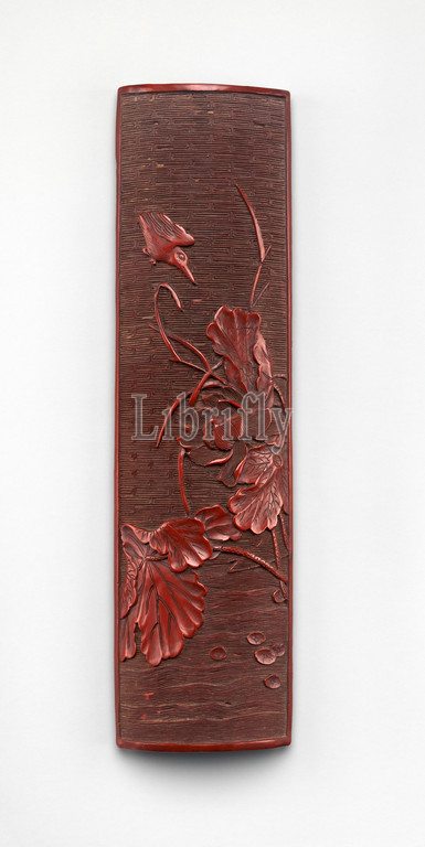明 剔紅蓮池水禽紋臂擱, Wrist rest, kingfisher, lotus, Ming dynasty, 1368–1644, China, Carved red lacquer, L, 9, 22.9 cm, Lacquer, pairing, kingfisher bird, symbolic, summer, motif, paintings, well, three-dimensional art, Rests, writing, painting, support, wrist, ensure, proper placement, brush