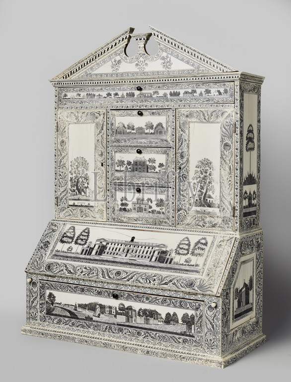 Writing cabinet, Gouverneur Janssens, Bottom side, foldable writing surface, drawer, compartments, contains, mirror decorated, way, exterior, Wall cabinet, two doors, side, three middle drawers, Top drawer, entire front width, hood, awarded, broken pediment, Decoration, within framed compartments, different buildings, residential buildings, colonial landscapes, drawn, drawers, doors, sides, cabinet, Cape, Good Hope, Jonkheer Jan Willem Janssens, O, I, ink, Vizagapatnam, c, 1802, 1806, wood, plant material, dogwood, ivory, looking glasses, drawing