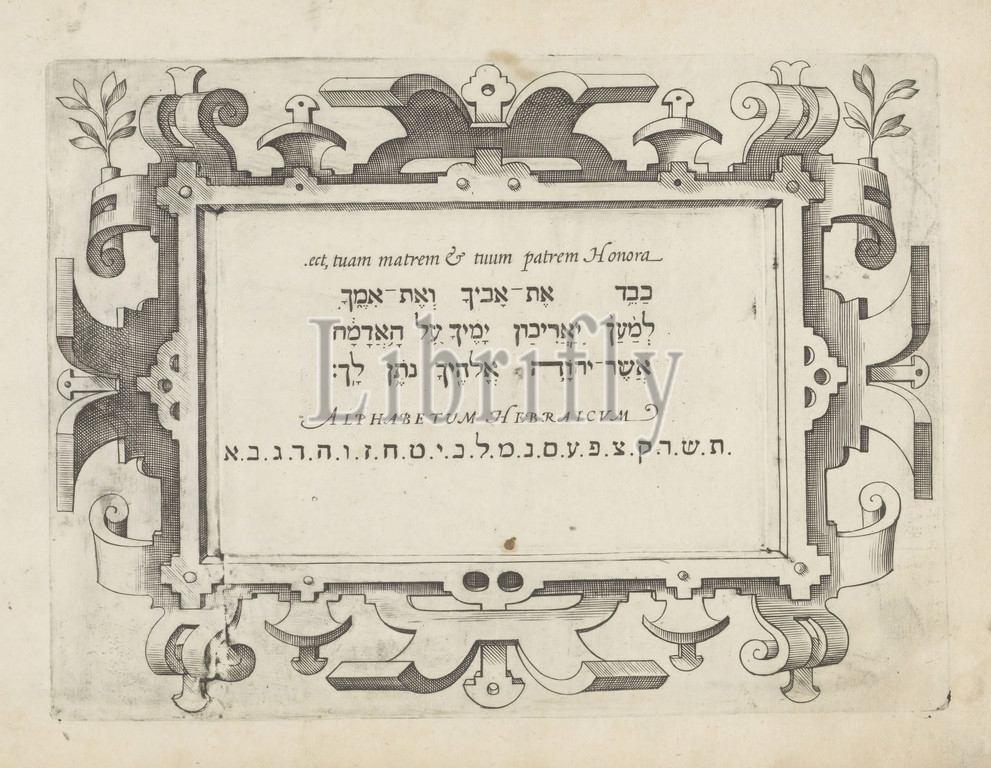 Writing example, ect, tuam matrem & tuum patrem Honora Alphabetum Hebraicum, title, object, Theatrum artis scribendi, series title, three lines, text, alphabet, Hebrew, example, set, rolling cart, print, part, album, calligraphy, ornament, cartouche, scrollwork, strapwork, Jodocus Hondius, I, Amsterdam, 1614, paper, engraving