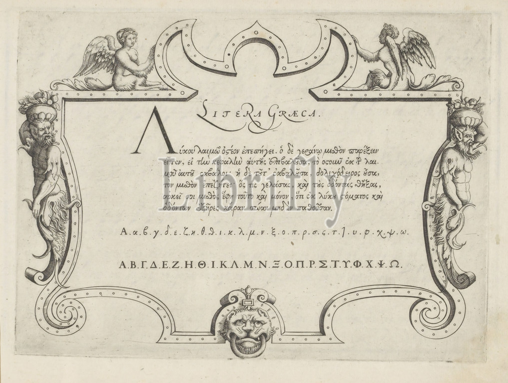 Writing example, Litera Graeca Litera Graeca, title, object, Theatrum artis scribendi, series title, Latin, six lines, text, Greek, lower case, upper case alphabet, hand, example, set, cartouche, four grotesques, mascaron, print, part, album, calligraphy, ornament, satyr, s, general, sphinx, lion, woman, Sfinge, Ripa, Jodocus Hondius, I, Amsterdam, 1614, paper, engraving