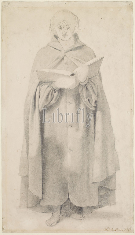 Wycliffe Reading, Translation, Bible, Drapery Study, Wycliffe, 1847 Ford Madox Brown, Book, Reading, Art Movement, Pre-Raphaelite, Drawing, Pencil, Chalk, Sketch, Barefoot, Male, Full-length, Study, Robe