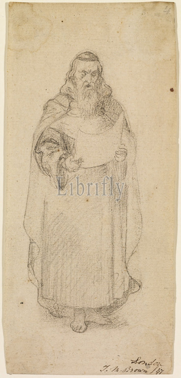 Wycliffe Reading his Translation of the Bible, Study of Wycliffe, 1847 Ford Madox Brown, Reading, Art Movement, Pre-Raphaelite, Drawing, Pencil, Chalk, Paper, Sketch, Barefoot, Male, Costume, Hat, Bearded, Full-length, Study
