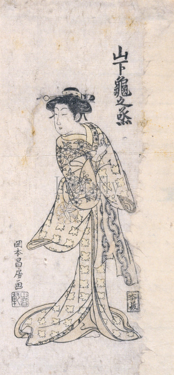 Yamashita Kamenojō IV, Okamoto Masafusa, Japanese, 1775, ink, paper, woodblock print, 11-9/16 x 5-1/2, image & sheet, remargined, right, Signed, artist, Okamoto Masafusa ga Artist's seal, unread Publisher's mark, Ōkichi, alt. readings, Daikichi, Ōyoshi, Inscribed, title, actor's name, Yamashita Kamenojō, Kamenojō IV, Asian Art