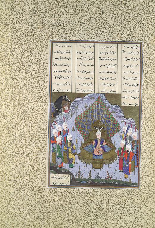 'Yazdigird II Accedes to the Throne', Folio 592r from the Shahnama (Book of Kings) of Shah Tahmasp, ca. 1530–35, Made in Iran, Tabriz, Opaque watercolor, ink, silver, and gold on paper, Painting: H. 7 1/8 x W. 6 3/4 in. (H. 18.1 x W. 17.2 cm), Codices, Painting attributed to Bashdan Qara (active ca. 1525–35), The aged shah Bahram Gur named his son Yazdigird II as his successor. Upon the death of his father, Yazdigird called his noblemen together and, seated on the Golden Throne of Iran, exhorted them to act with justice, humanity, and wisdom