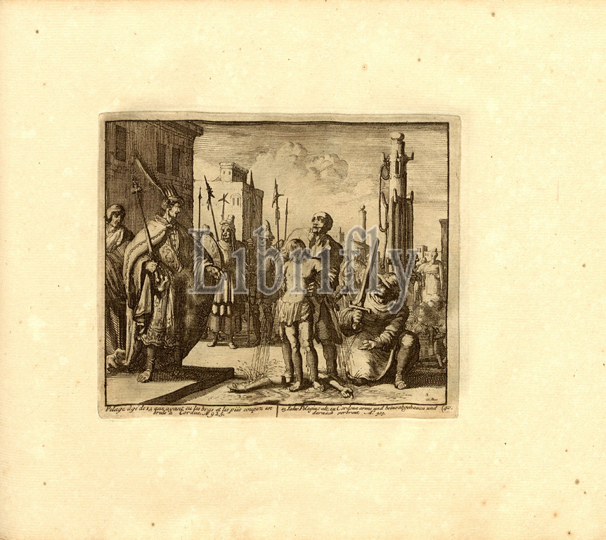 13-year-old hen, having had his arms cut off, is burned at Corue, Anno 925, Parallel title: 13 years old Pelagius, cut off to Cordoua's arms and legs and afterwards used, A nn o 925, copperplate engraving, 40.), S. 89, Luyken, Jan (inv. et fec.), Jan Luyken: Théâtre des martyrs: depuis la mort de J.Christ jusqu'à present: représenté en très belles tailles-douces = Schau-Bühne der Martyrer; gezeichnet und in Kuppfer gestochen. Leyde: chez Pierre Van der Aa, [1711]