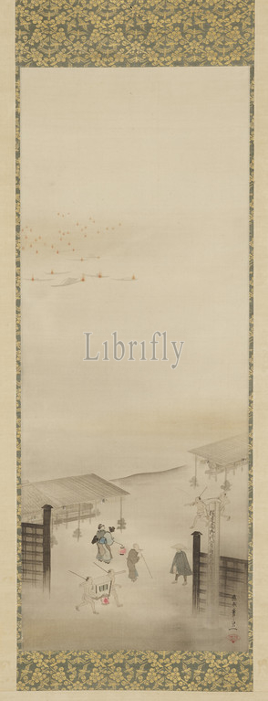 Yoshiwara, Shinagawa, Suzuki Kiitsu, Japanese, 1796-1858, Edo, ink, color, gold, silk, 33-5/8 x 13-1/4, image, 66-7/8 x 20-3/4, overall, Signed, O-kyu, order, Seisei Kiitsu Seal, Shukurin, Asian Art